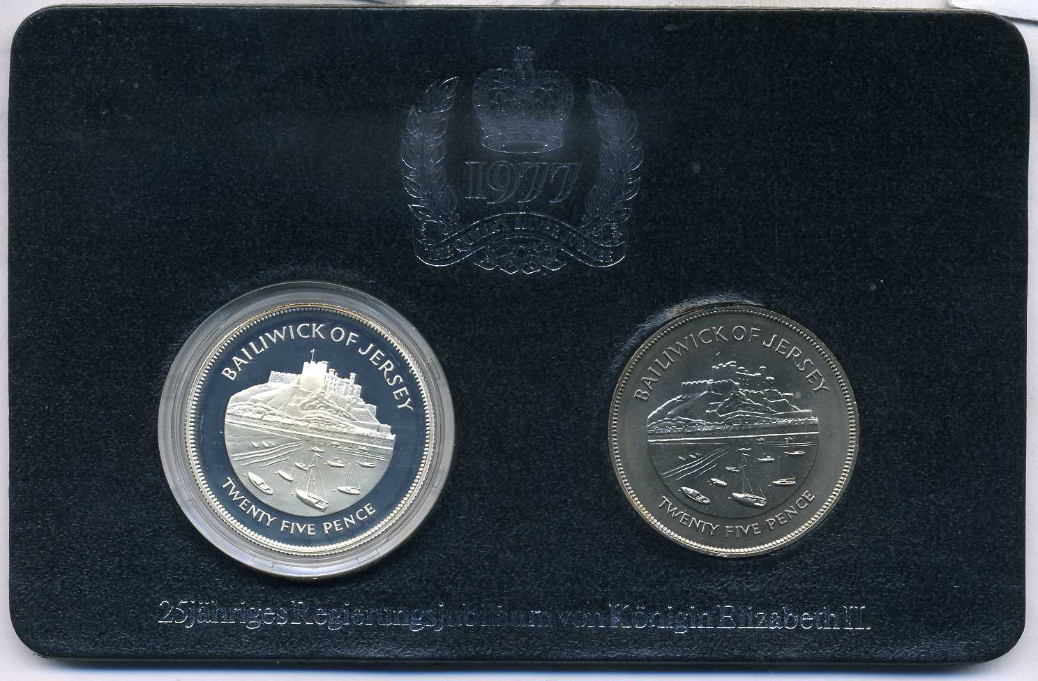 Джерси набор из 2 монет по 25 пенсов 1977 25 лет правления Елизаветы II, в буклете KM 44, 44а серебро, медно-никель PROOF, UNC 3-6-3-26