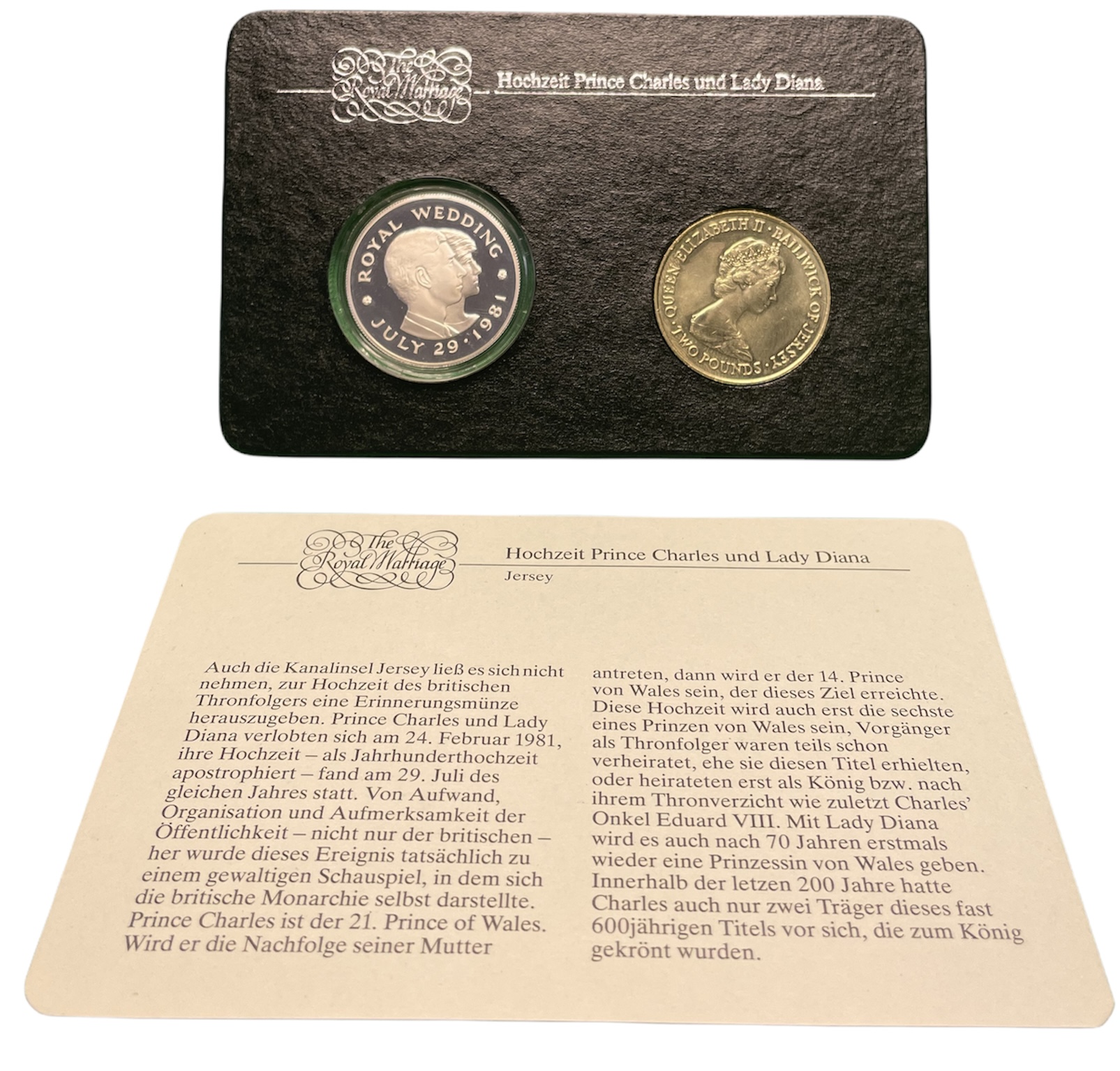 Джерси набор из 2 монет по 2 фунта 1981 королевская свадьба принца Чарльза и леди Дианы Спенсер, 29 июля 1981 года, в буклете KM 52, 52а серебро, медно-никель PROOF, UNC 5-6-4-09