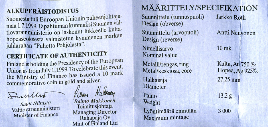 Финляндия 10 марок 1999 председательство Финляндии в Евросоюзе, с сертификатом KM 91а биметалл, серебро, золото UNC 10-010-61