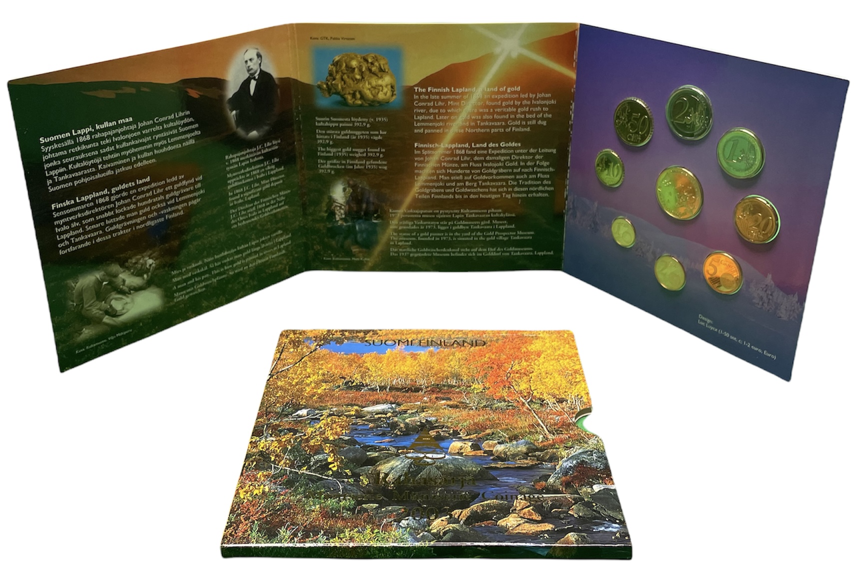 Финляндия евронабор из 8 монет + жетон 2003 золотодобытчики, официальный набор в оригинальном буклете биметалл UNC 7-5-6-04