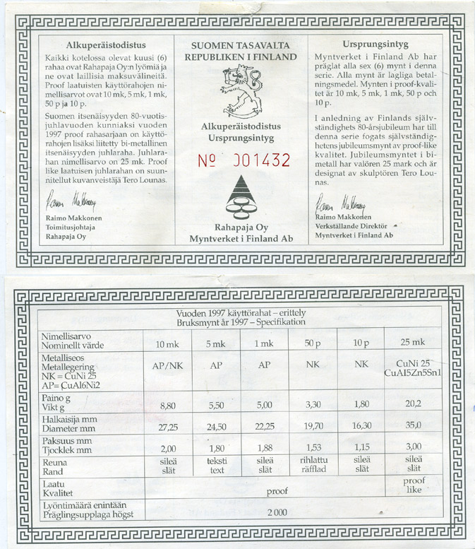 Финляндия набор из 6 монет 1997 официальный набор, с сертификатом, включая 25 марок PROOF 5-6-2-8