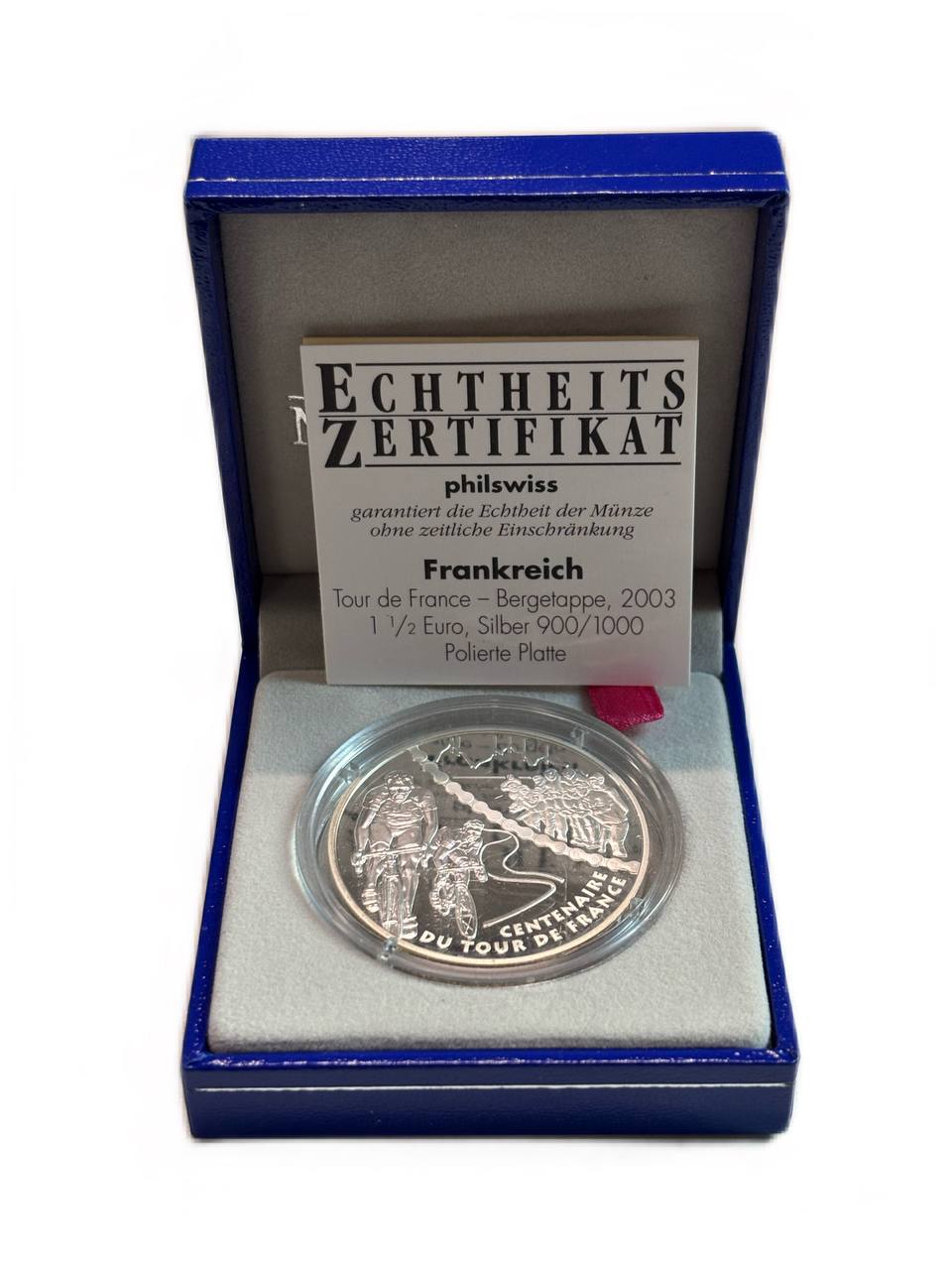 Франция 1 1/2 евро 2003 100 лет велогонкам Тур де Франс, два велосипедиста, в оригинальной коробке, сертификат KM 1323 серебро PROOF 1-6-4-61