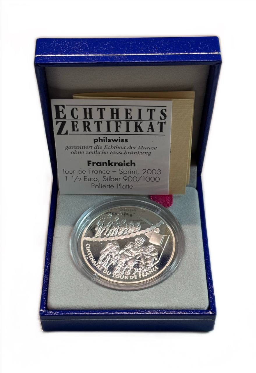 Франция 1 1/2 евро 2003 100 лет велогонкам Тур де Франс, группы велосипедистов, в оригинальной коробке, сертификат KM 1324 серебро PROOF 1-6-4-60