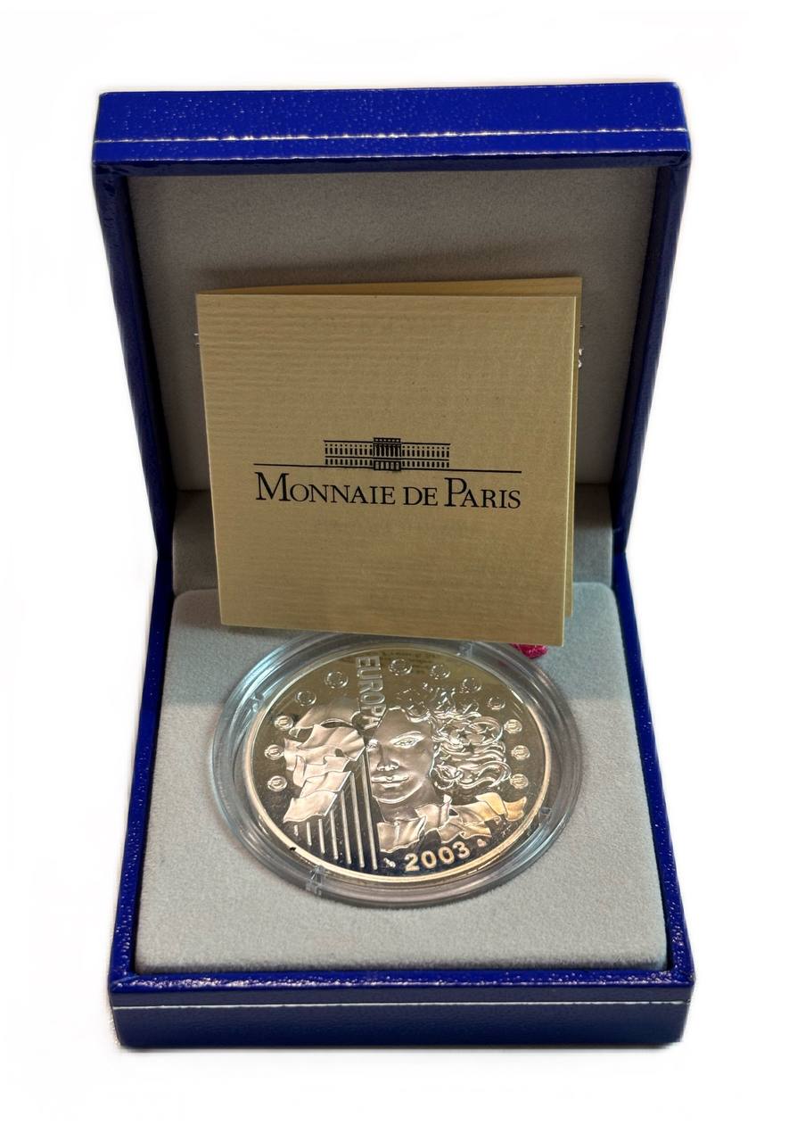 Франция 1 1/2 евро 2003 первая годовщина введения евро, в оригинальной коробке, сертификат KM 1338 серебро PROOF 1-6-4-40