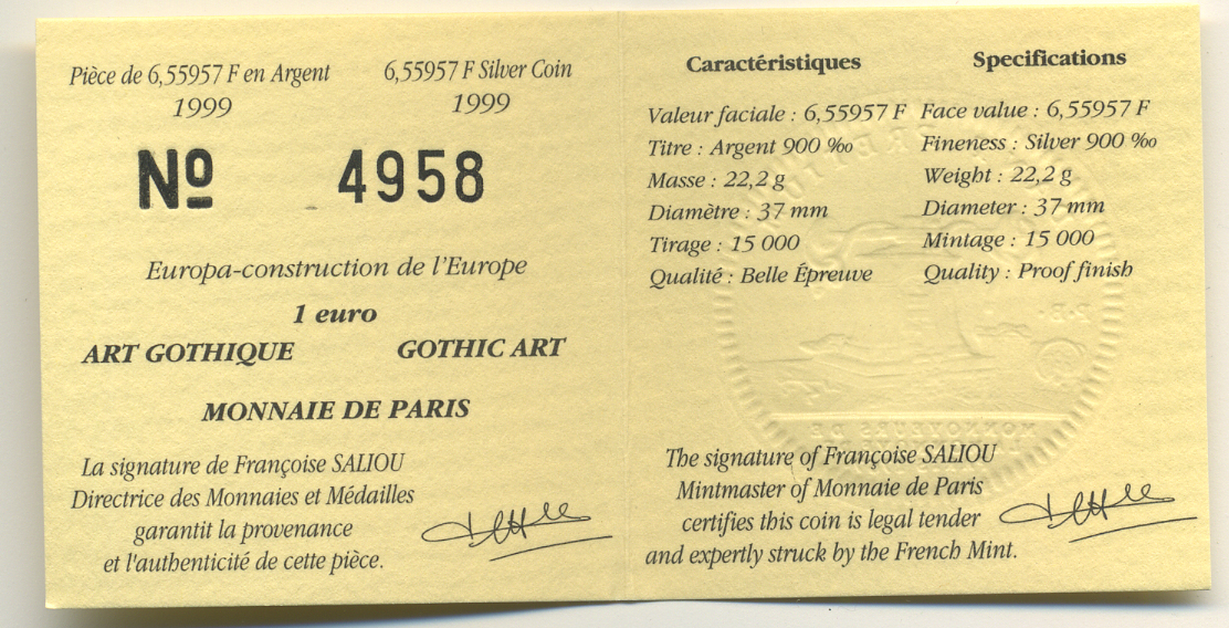 Франция 1 евро = 6,55957 франков 2000 готический стиль в архитектуре (XII-XVI веков) в коробке с сертификатом KM 1246 серебро PROOF 4-3-3-12