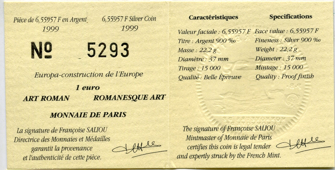 Франция 1 евро = 6,55957 франков 2000 романский стиль в архитектуре Средневековья (X-XII века) в коробке с сертификатом KM 1245 серебро PROOF 4-3-3-09