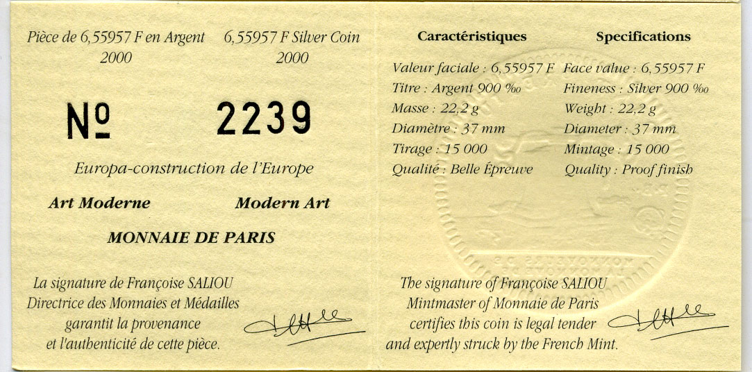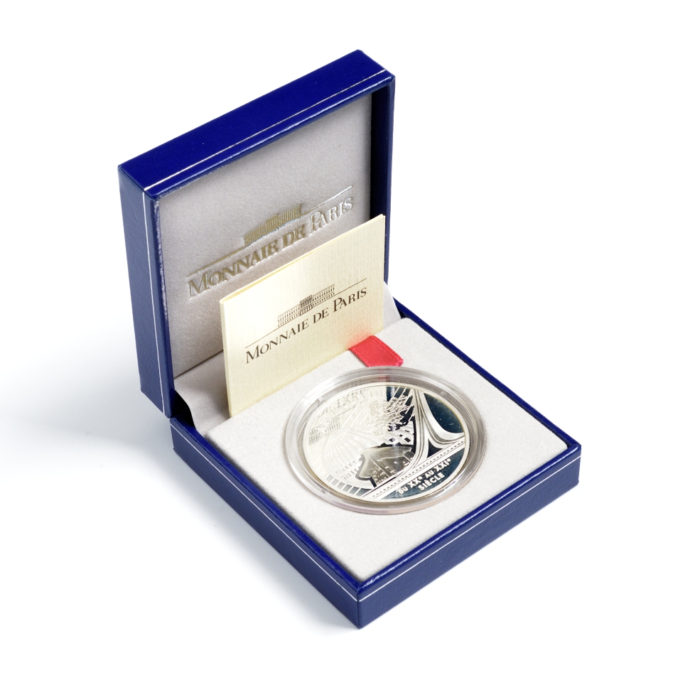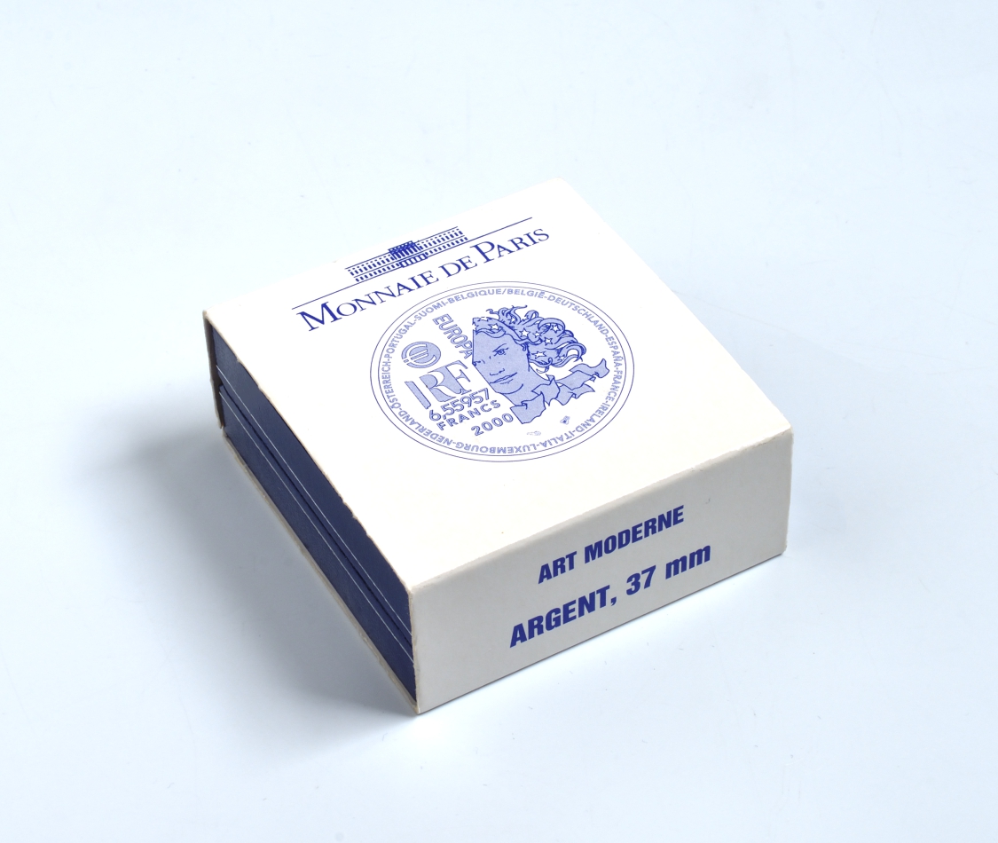 Франция 1 евро = 6,55957 франков 2000 современная архитектура XX-XXI веков в коробке с сертификатом KM 1228 серебро PROOF 4-3-3-16