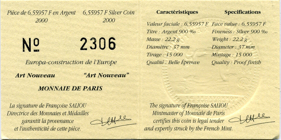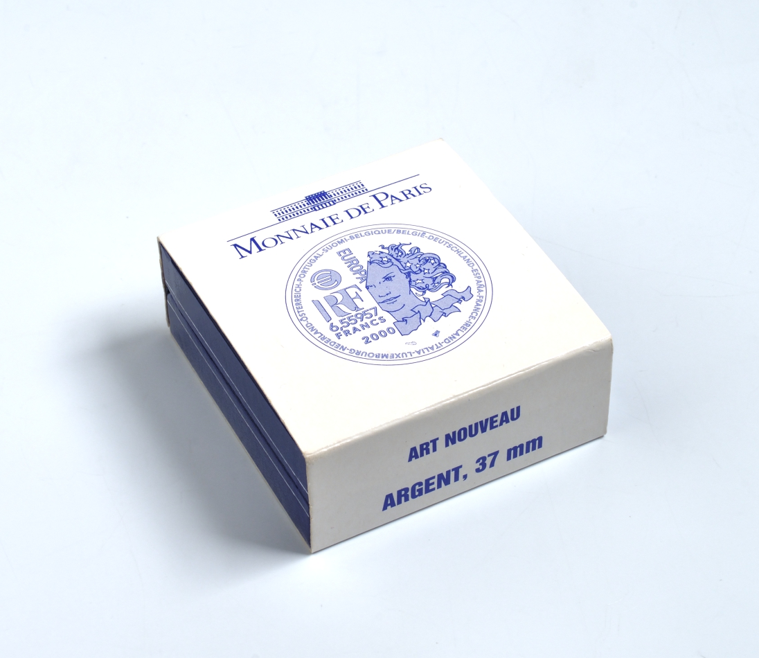 Франция 1 евро = 6,55957 франков 2000 стиль арт-нуво в архитектуре (XIX-XX веков) в оригинальной коробке, с сертификатом KM 1227 серебро PROOF 4-3-2-13