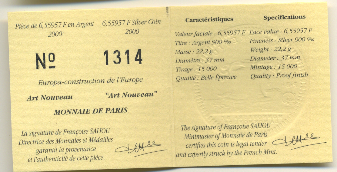 Франция 1 евро = 6,55957 франков 2000 стиль арт-нуво в архитектуре (XIX-XX веков) в оригинальной коробке, с сертификатом KM 1227 серебро PROOF 5-6-1-43