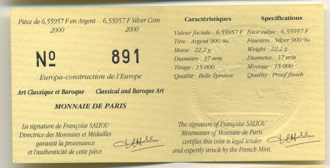 Франция 1 евро = 6,55957 франков 2000 классицизм и барокко в архитектуре (XVII- XVIII веков) в оригинальной коробке, с сертификатом KM 1226 серебро PROOF 4-3-3-17