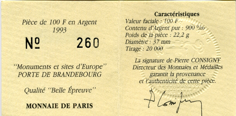Франция 100 франков - 15 экю 1993 серия архитектурные монументы Европы (Бранденбургские ворота в Берлине), в коробке с сертификатом KM серебро PROOF 7-6-1-43