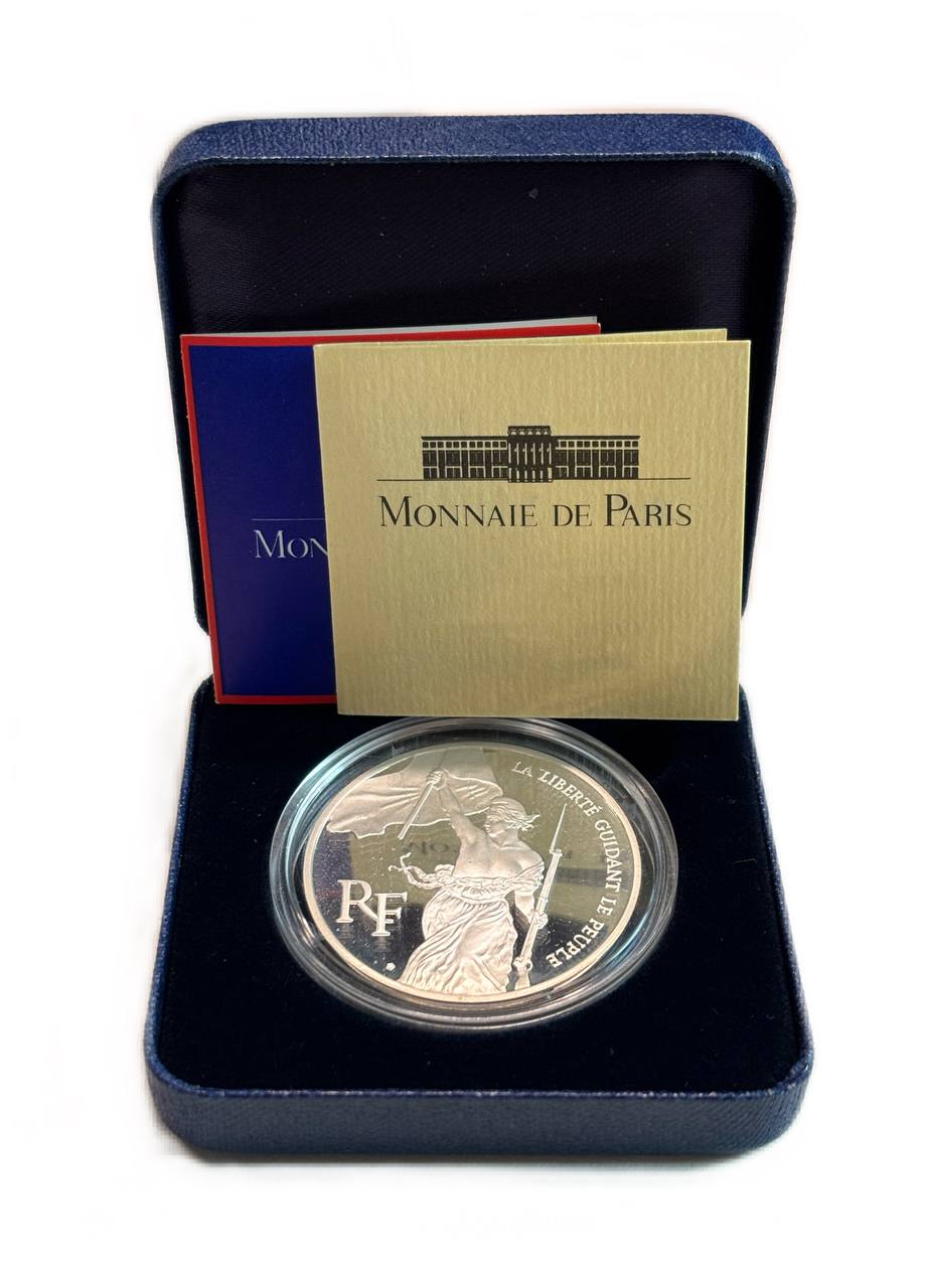Франция 100 франков 1993 200 лет Лувра, Свобода, Делакруа, в оригинальной коробке, сертификат KM 1018.2 серебро PROOF 1-6-4-53
