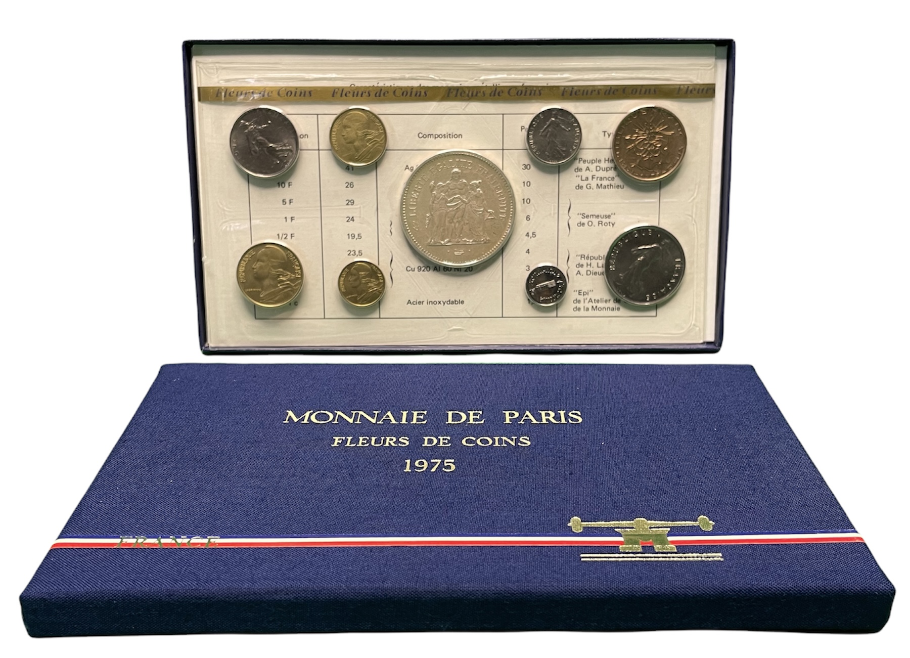 Франция госнабор из 9 монет 1975 в оригинальном буклете 50 франков Геркулес серебро UNC 7-5-2-26