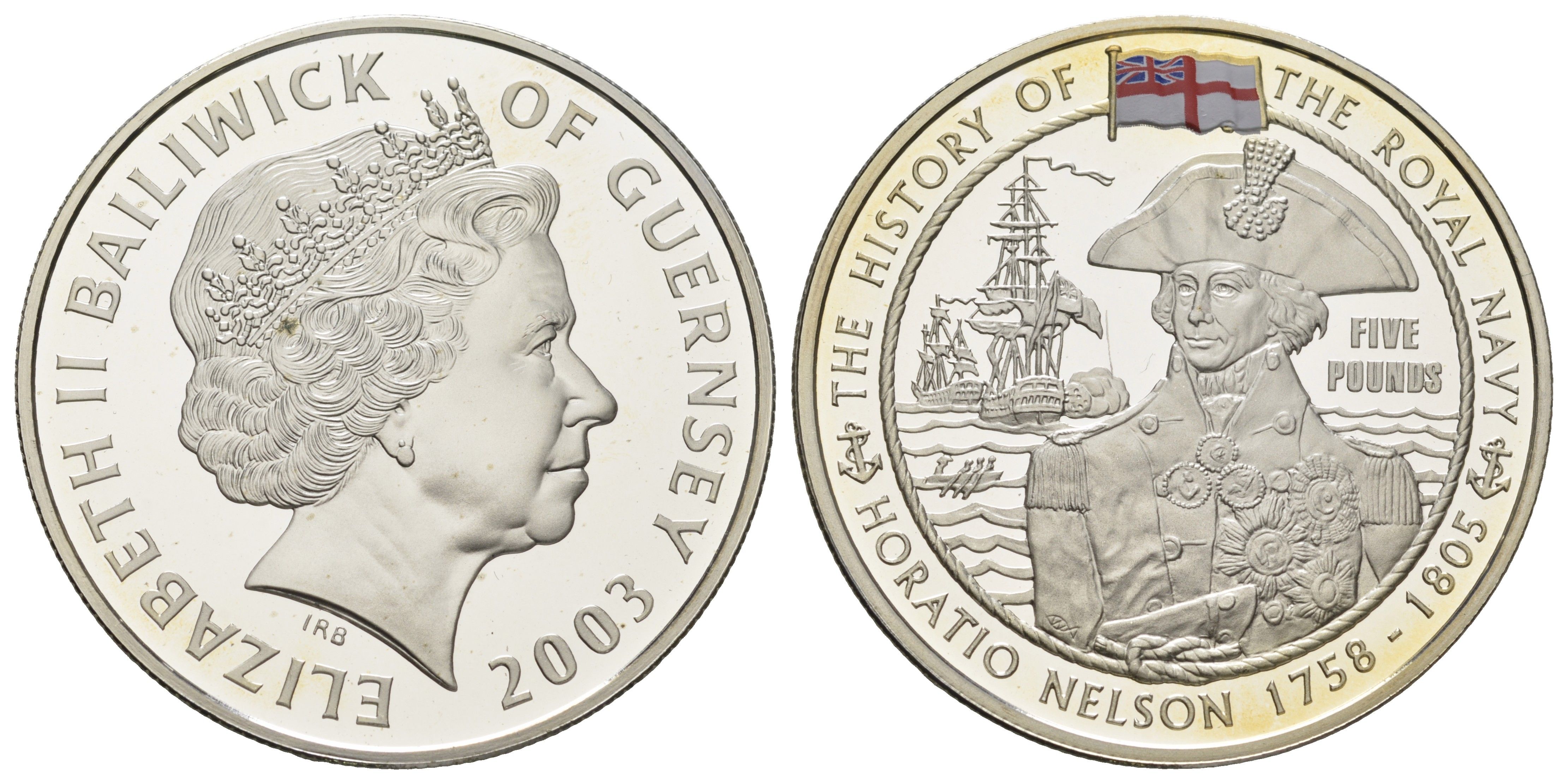 Гернси 5 фунтов 2003 История королевского флота - Горацио Нельсон KM 160a серебро PROOF 11-085-42