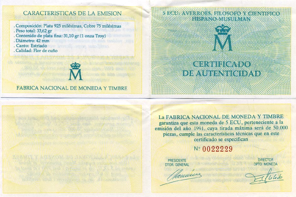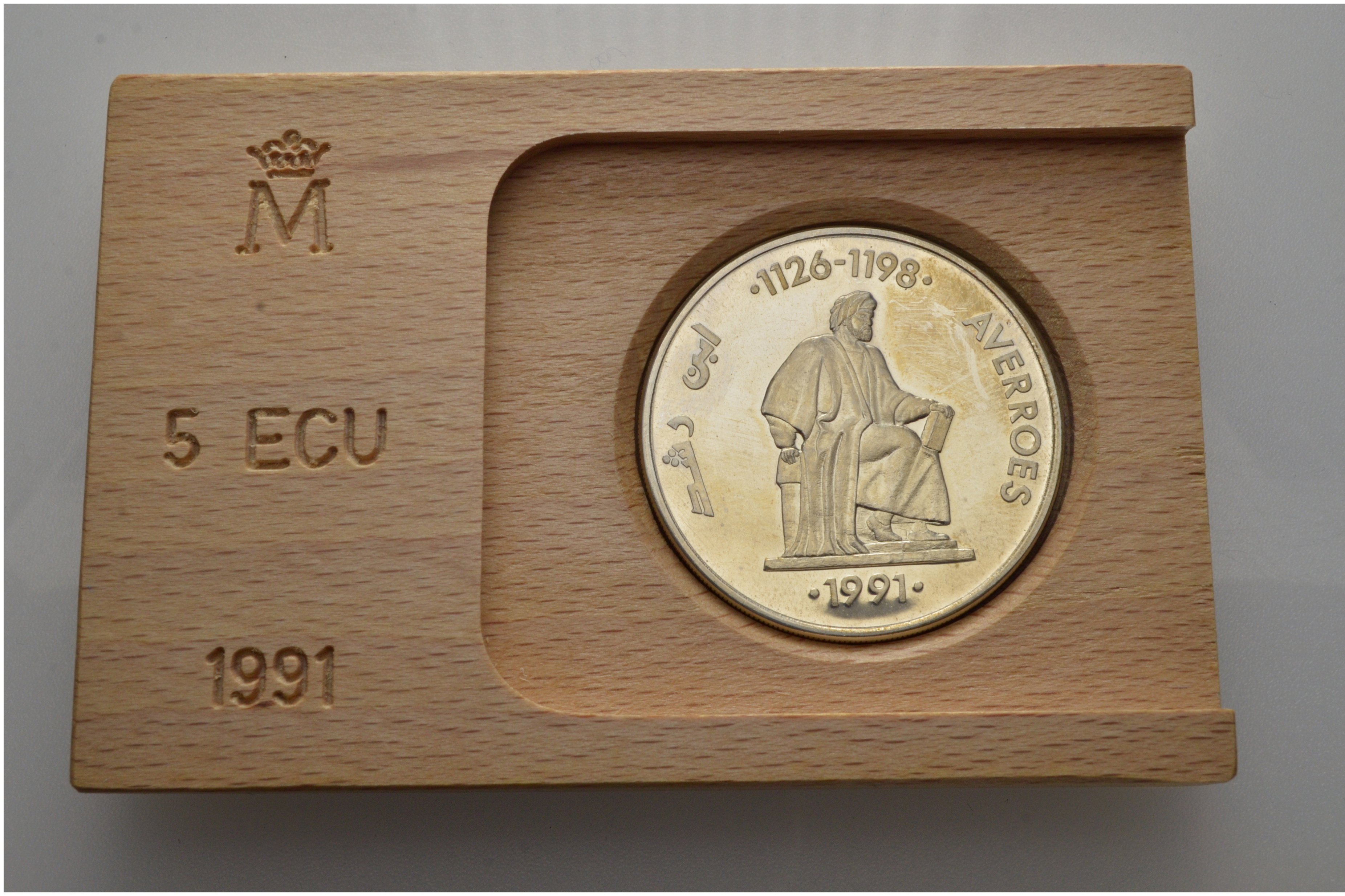 Испания 5 экю 1991 Аверроэс (Ибн Рушд) западно-арабский философ (1126-1198), в оригинальной деревянной коробке, с сертификатом серебро PROOF 4-3-1-12
