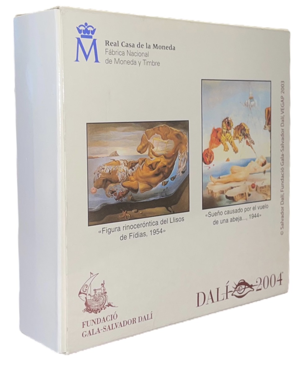 Испания 50 евро 2004 Сальвадор Дали, "За секунду до пробуждения", "Мягкий автопортрет с жареным беконом", позолота, коробка, сертификат КМ 1057 серебро PROOF 6-5-1-20
