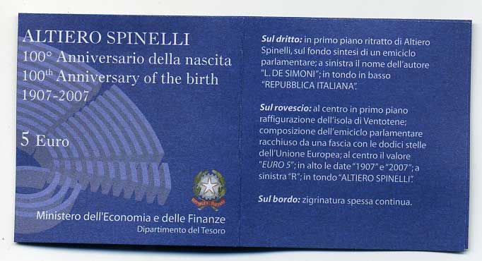 Италия 5 евро 2007 100 лет со дня рождения Альтьери Спинелли KM 293 серебро UNC 6-5-1-31