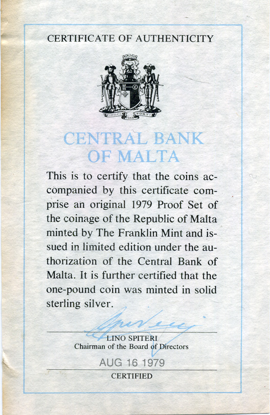 Мальта набор из 10 монет 1979 в запайке, в оригинальной коробке, с сертификатом, тираж 6577 экз. KM PS 7, KM (5-12, 29b, 51) серебро PROOF 2-6-3-09