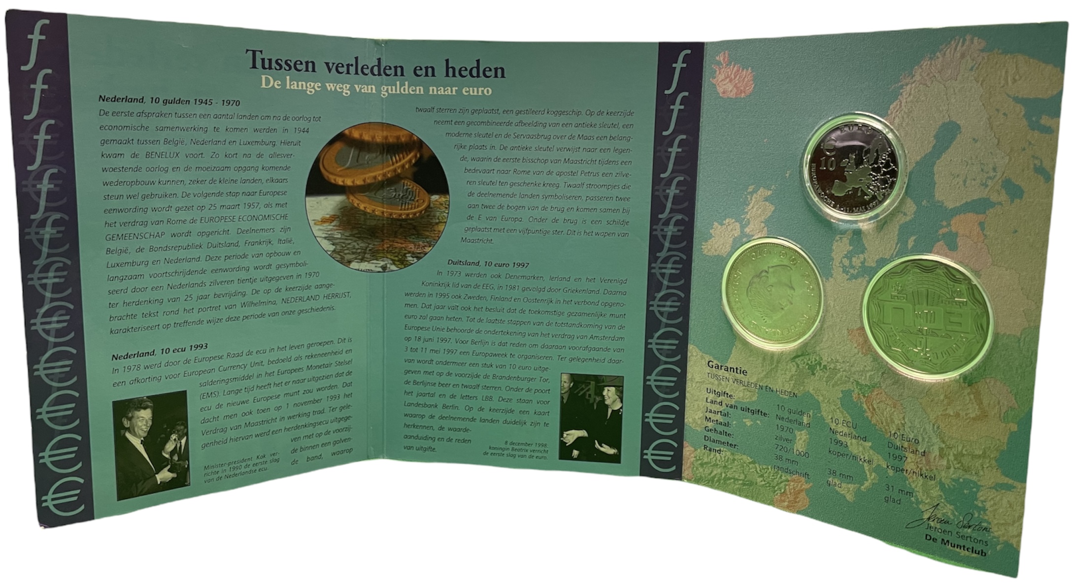 Нидерланды набор из 3 монет 1970-1997 10 гульденов 1970, 10 экю 1993, 10 евро 1997, буклет, сертификат KM 195, серебр, медно-никель 7-6-1-24