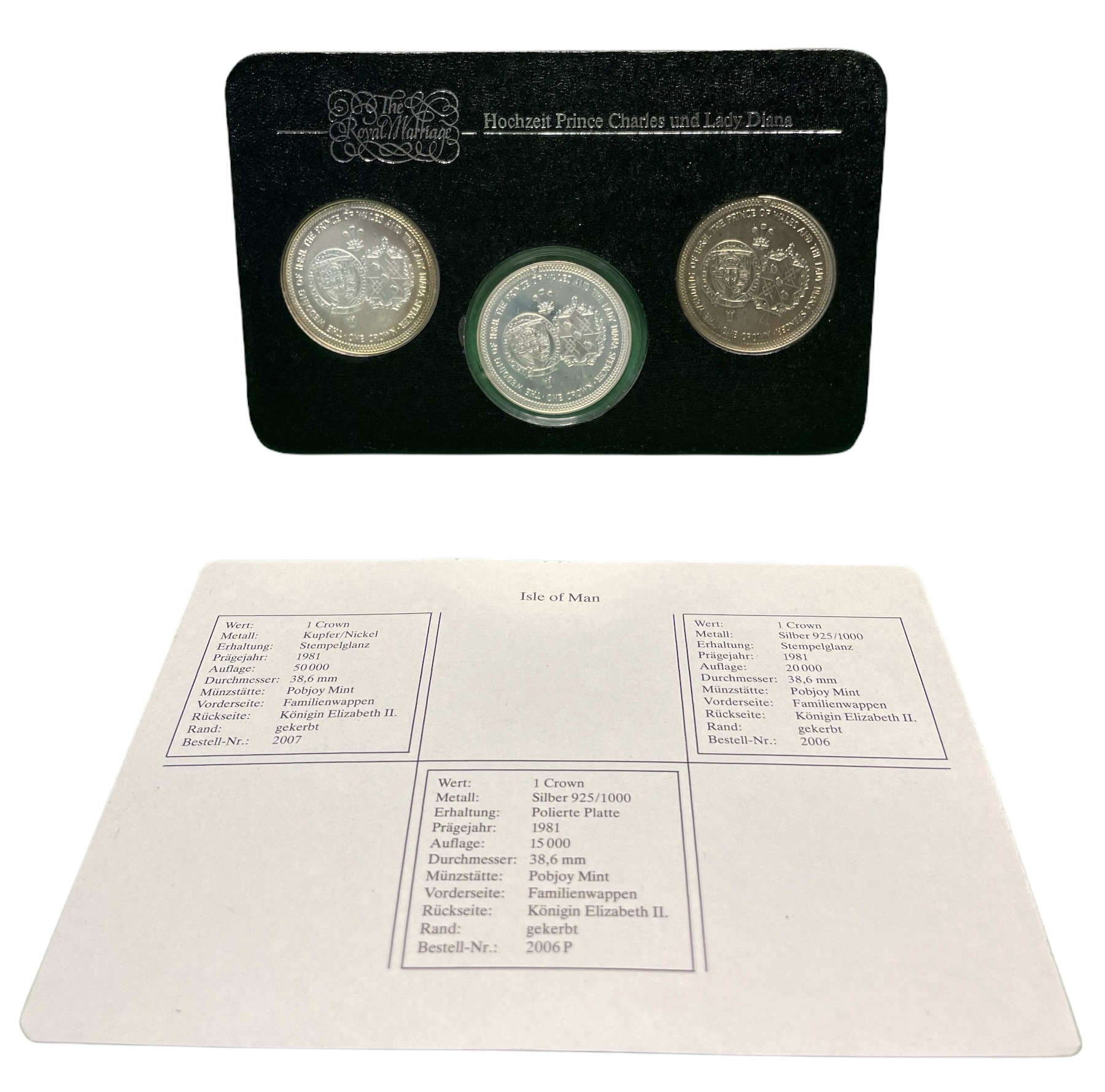Остров Мэн набор из 3 монет по 1 крона 1981 Королевская свадьба принца Чарльза и леди Дианы, гербы, в буклете KM 81, 81а, 81а серебро, серебро, медно-никель PROOF, UNC, UNC 7-5-1-18