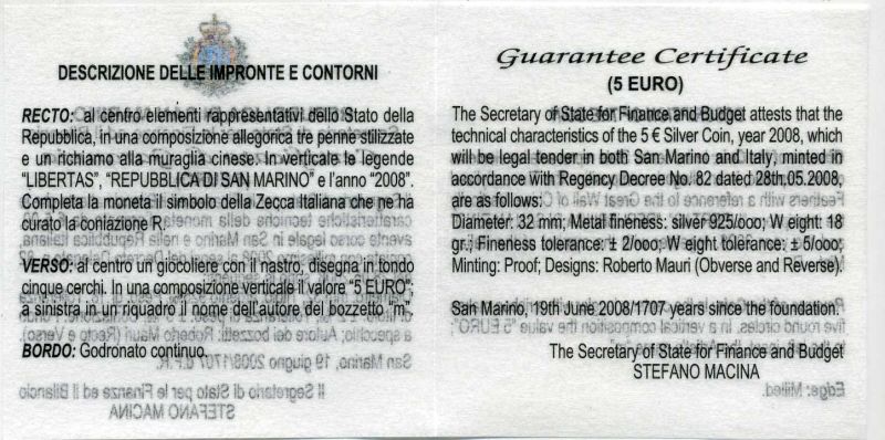 Сан-Марино 5 евро 2008 Олимпиада в Пекине, танец с лентами KM 513 серебро PROOF 4-3-2-05