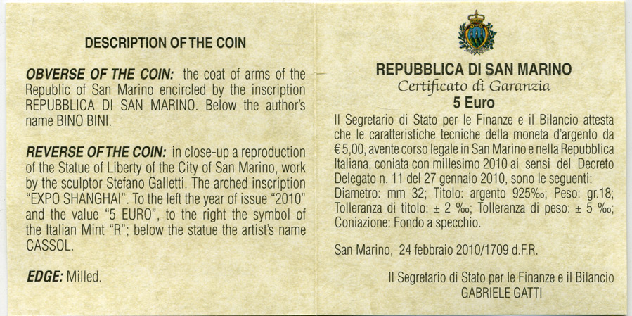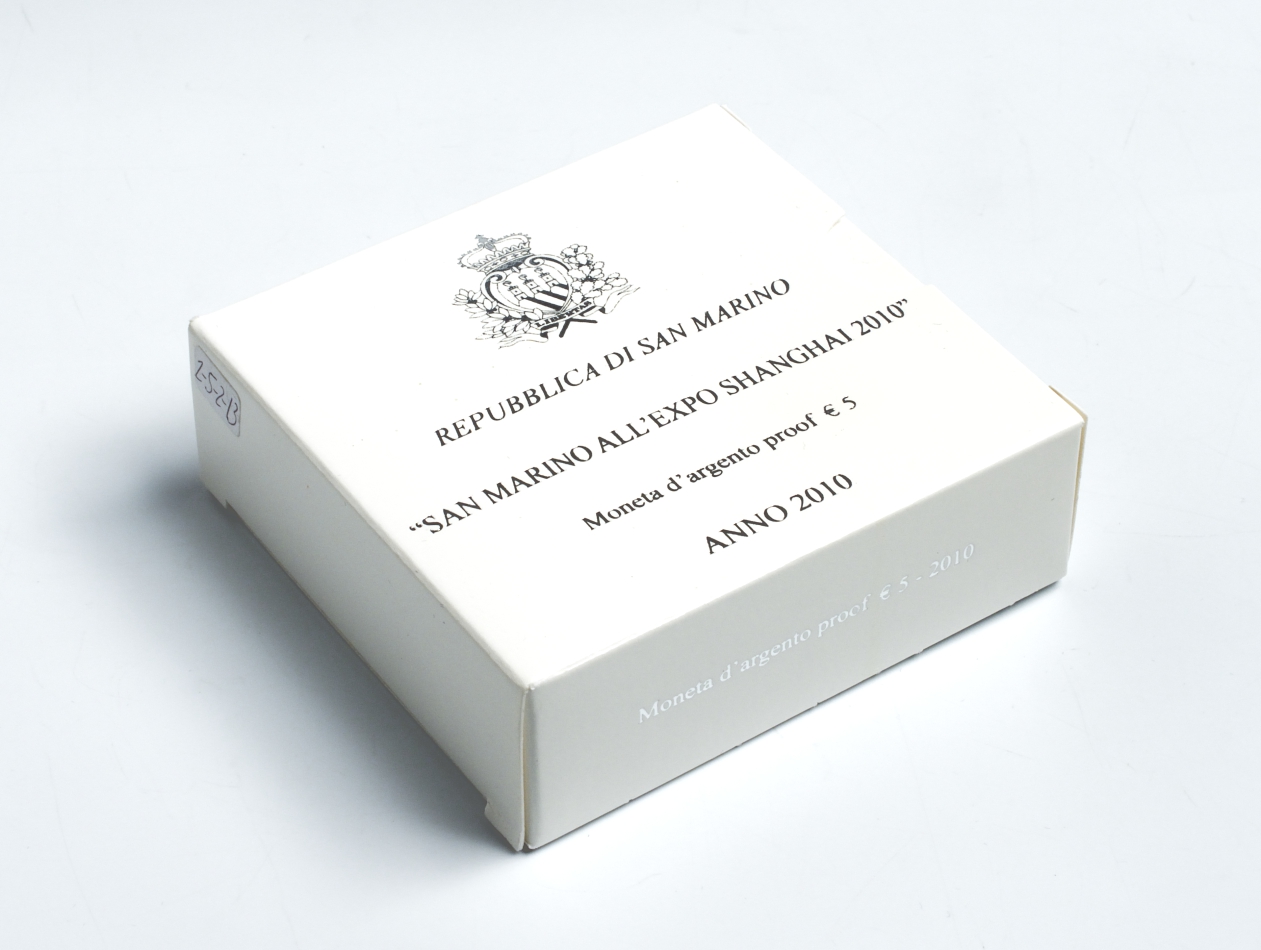 Сан-Марино 5 евро 2010 Экспо Шанхай-2010, в оригинальной коробке с сертификатом KM NEW серебро PROOF 2-5-2-13