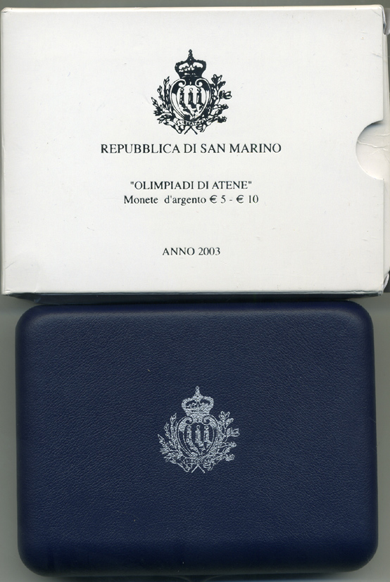 Сан-Марино набор 5 и 10 евро 2003 Олимпийские игры в Афинах 2004, виды спорта, в оригинальной коробке, с сертификатом KM 453, 454 серебро PROOF 7-1-64