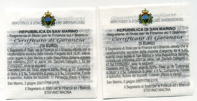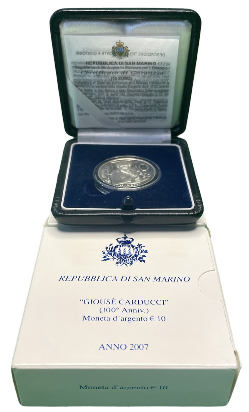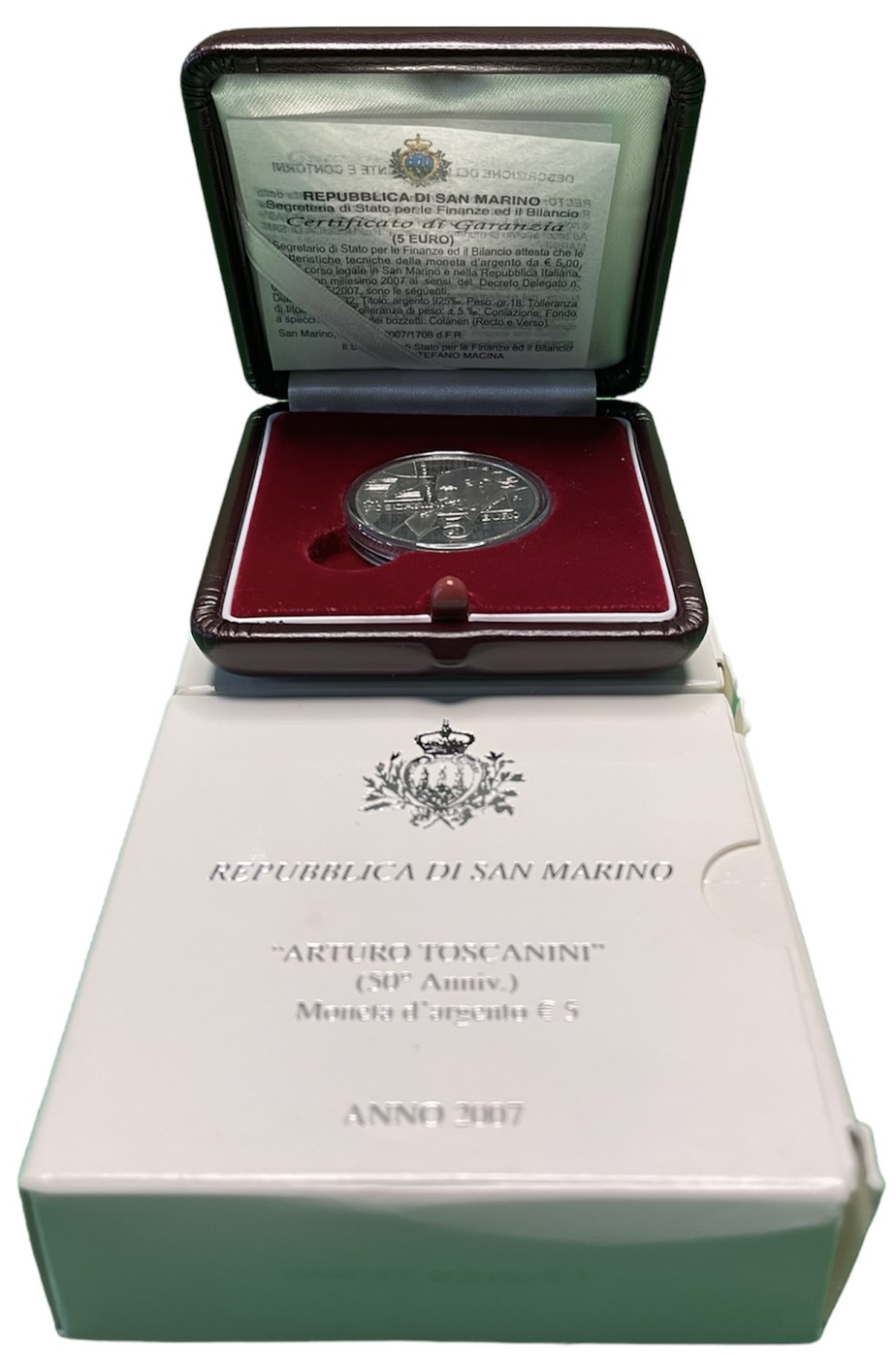 Сан-Марино набор 5 евро + 10 евро 2007 поэт Джозуэ Кардуччи и дирижер Артуро Тосканини, в оригинальной коробке, с сертификатом KM 474, 475 серебро PROOF 1-4-4-02
