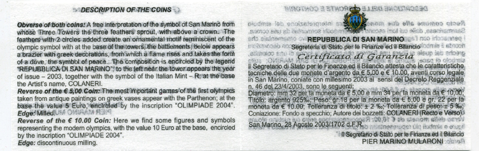 Сан-Марино набор 5 и 10 евро 2003 Олимпийские игры в Афинах 2004, виды спорта, в оригинальной коробке, с сертификатом KM 453, 454 серебро PROOF 7-1-65