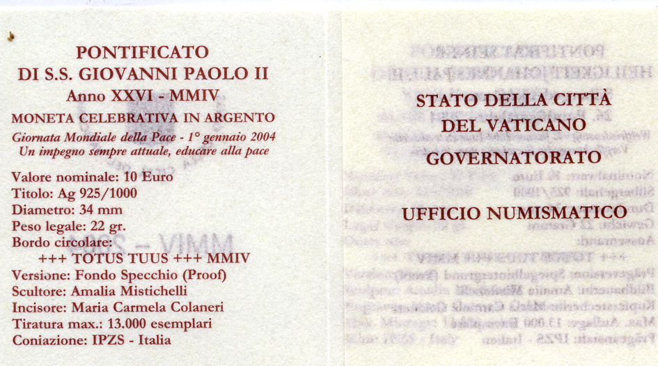 Ватикан 10 евро 2004 Иоанн Павел II, 150 лет провозглашения догмата о непорочном зачатии, в оригинальной коробке, с сертификатом KM 360 серебро PROOF 7-1-49