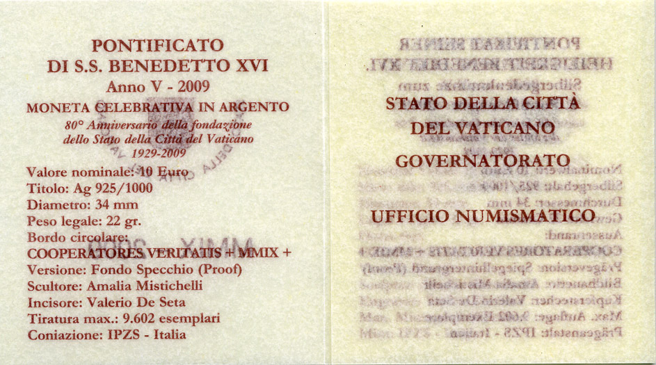 Ватикан 10 евро 2009 Бенедикт XVI, 80 лет Латеранскому договору, в оригинальной коробке, с сертификатом KM 417 серебро PROOF 7-1-53