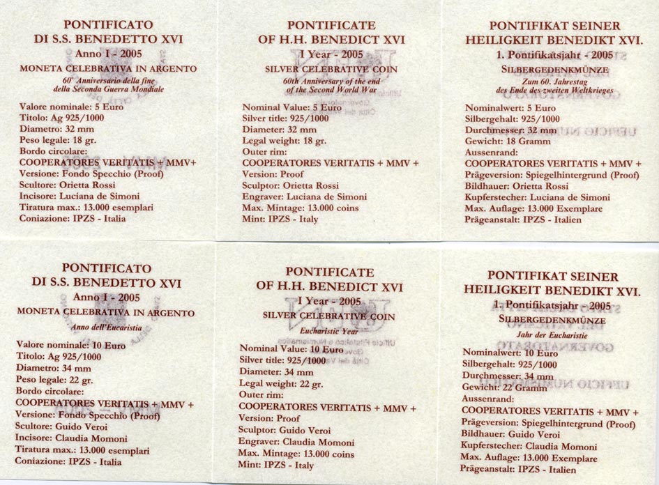 Ватикан 5 евро и 10 евро 2005 60 лет мира и свободы в Европе серебро PROOF 7-5-4-09