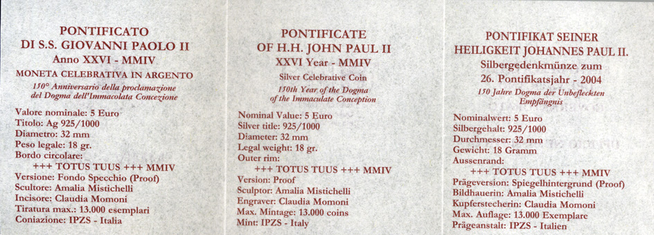Ватикан 5 евро 2004 Иоанн Павел II, 150 лет провозглашения догмата о непорочном зачатии, в оригинальной коробке, с сертификатом KM 359 серебро PROOF 2-4-2-26