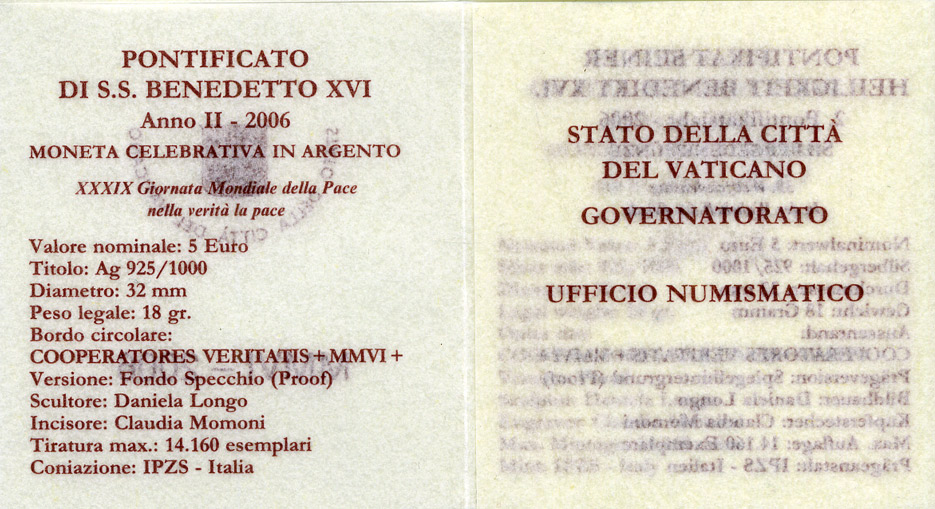 Ватикан 5 евро 2006 Бенедикт XVI, всемирный день мира, в оригинальной коробке, с сертификатом KM 395 серебро PROOF 7-1-31