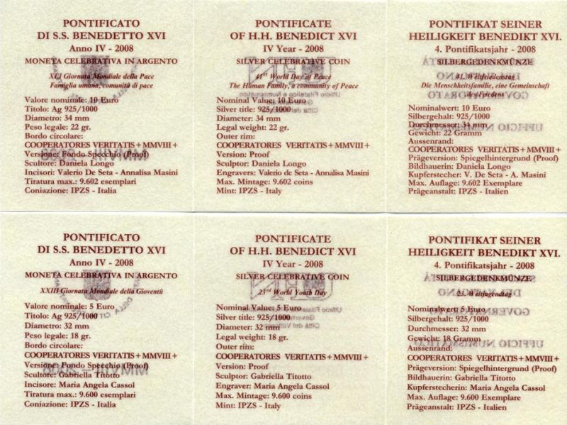 Ватикан 5 евро 2008 Всемирный день молодежи и 10 евро 2008 Всемирный день мира, Бенедикт XVI, в оригинальных коробках с сертификатами KM 406, 407 серебро PROOF 4-3-3-04