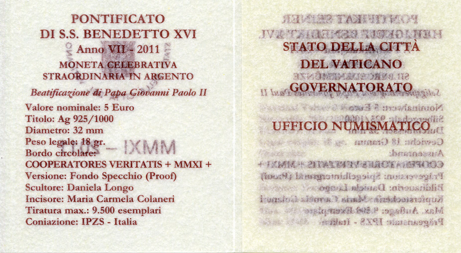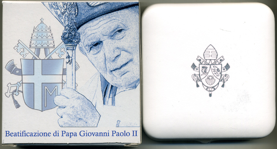 Ватикан 5 евро 2011 Бенедикт XVI, беатификация Папы Римского Иоанна Павла II, в оригинальной коробке, с сертификатом KM 429 серебро PROOF 7-1-1-25