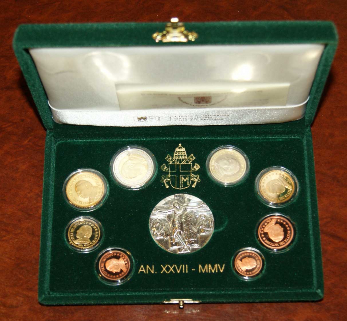 Ватикан евронабор из 8 монет + серебряная медаль 2005 Папа Иоанн Павел II, в оригинальной коробке, с сертификатом KM PS 18 биметалл PROOF 7-1-1-12