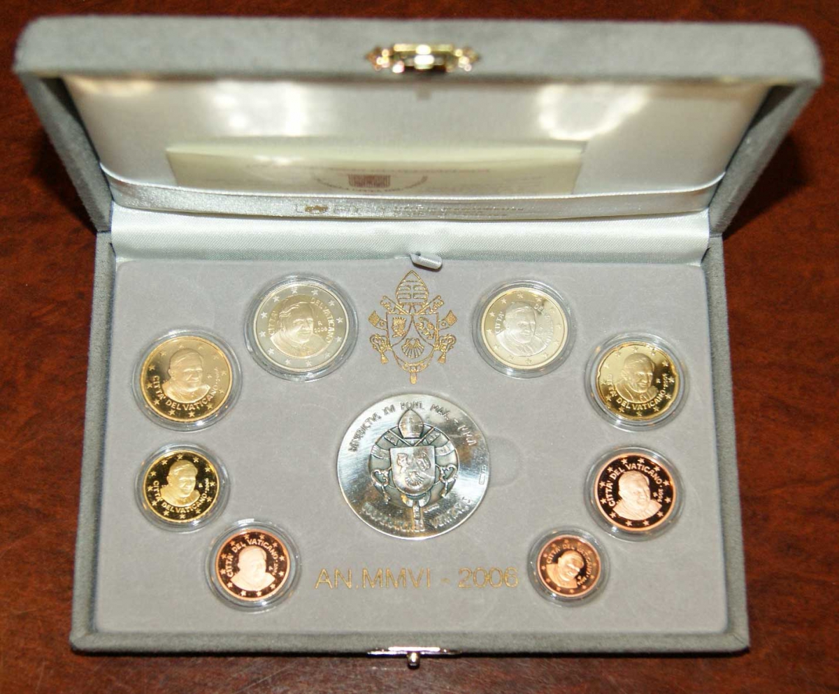 Ватикан евронабор из 8 монет + серебряная медаль 2006 Бенедикт XVI, в оригинальной коробке, с сертификатом KM PS 19 биметалл PROOF 7-1-1-13