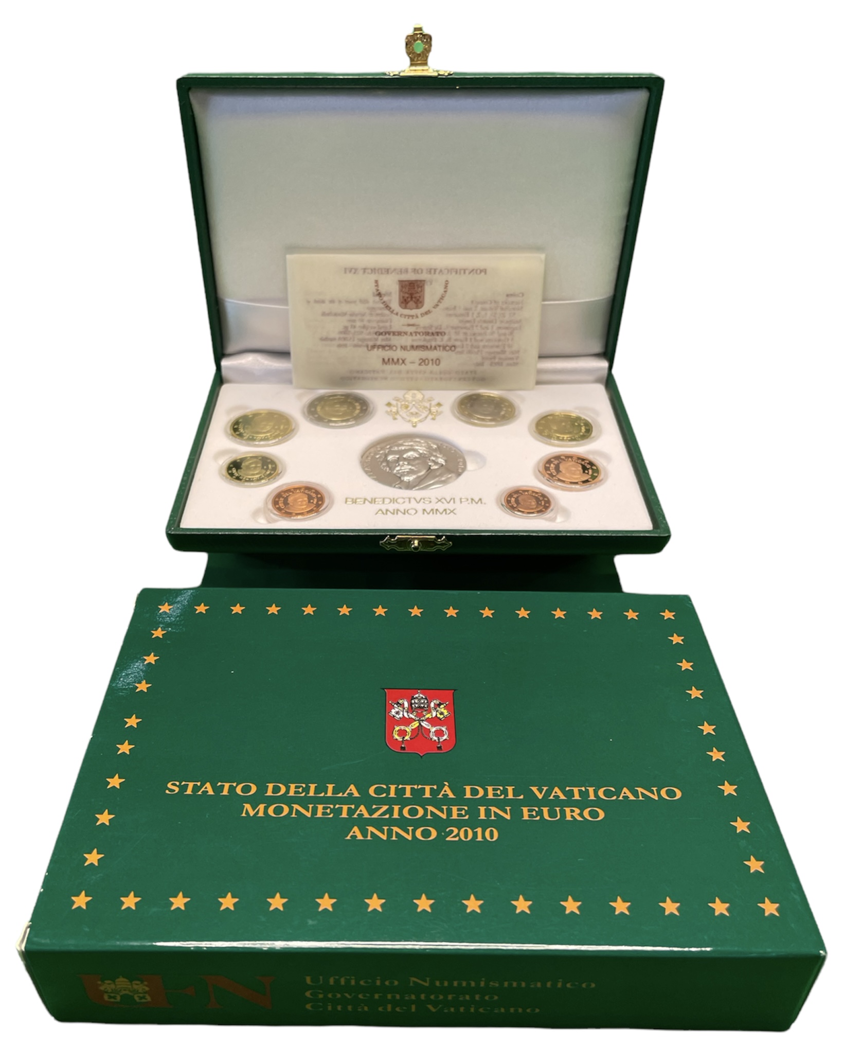 Ватикан евронабор из 8 монет + серебряная медаль 2010 Бенедикт XVI, в оригинальной коробке, с сертификатом KM PS 23 биметалл PROOF 5-4-6-02